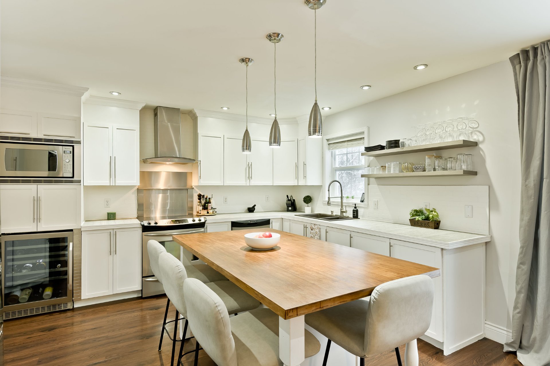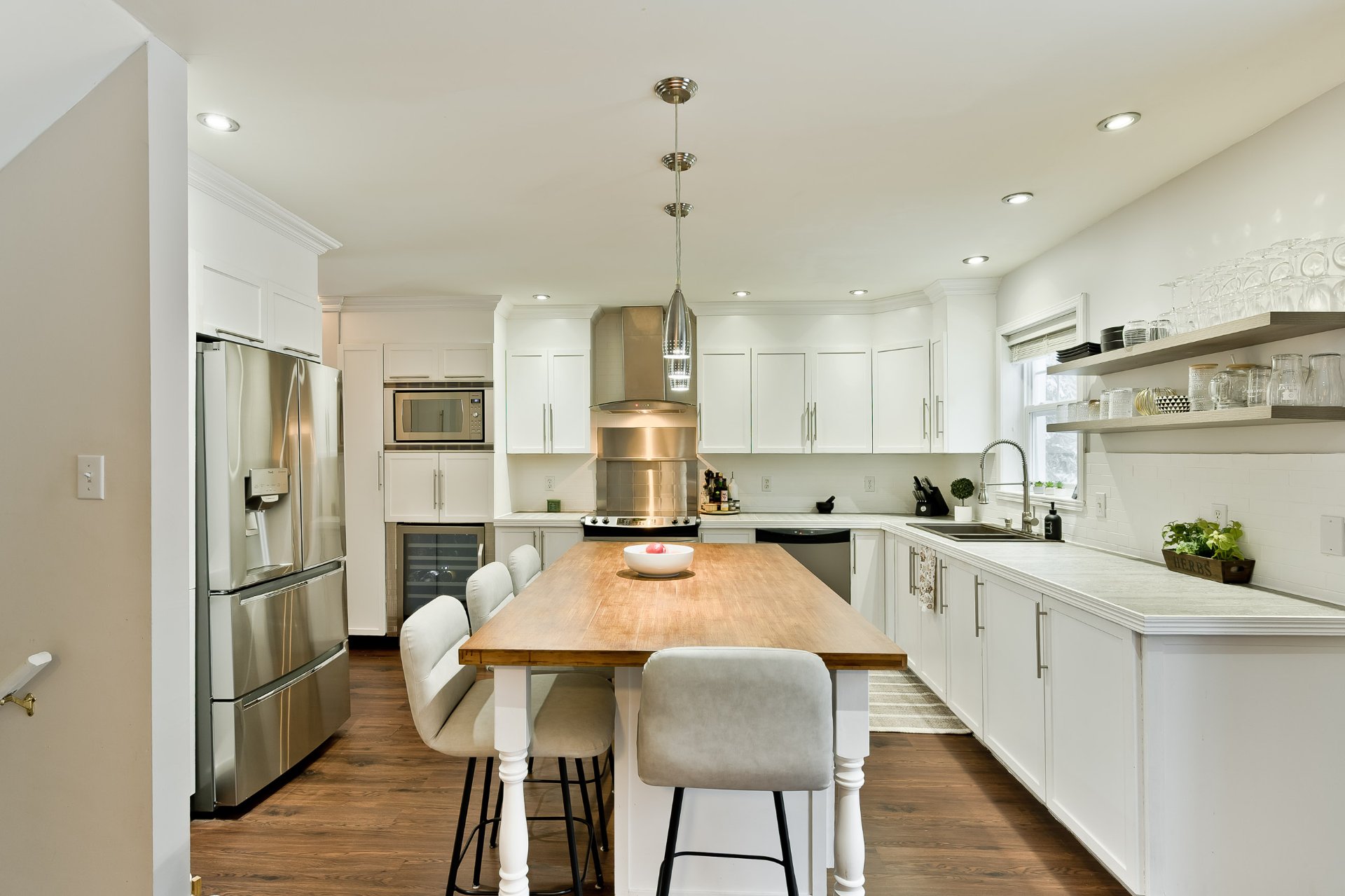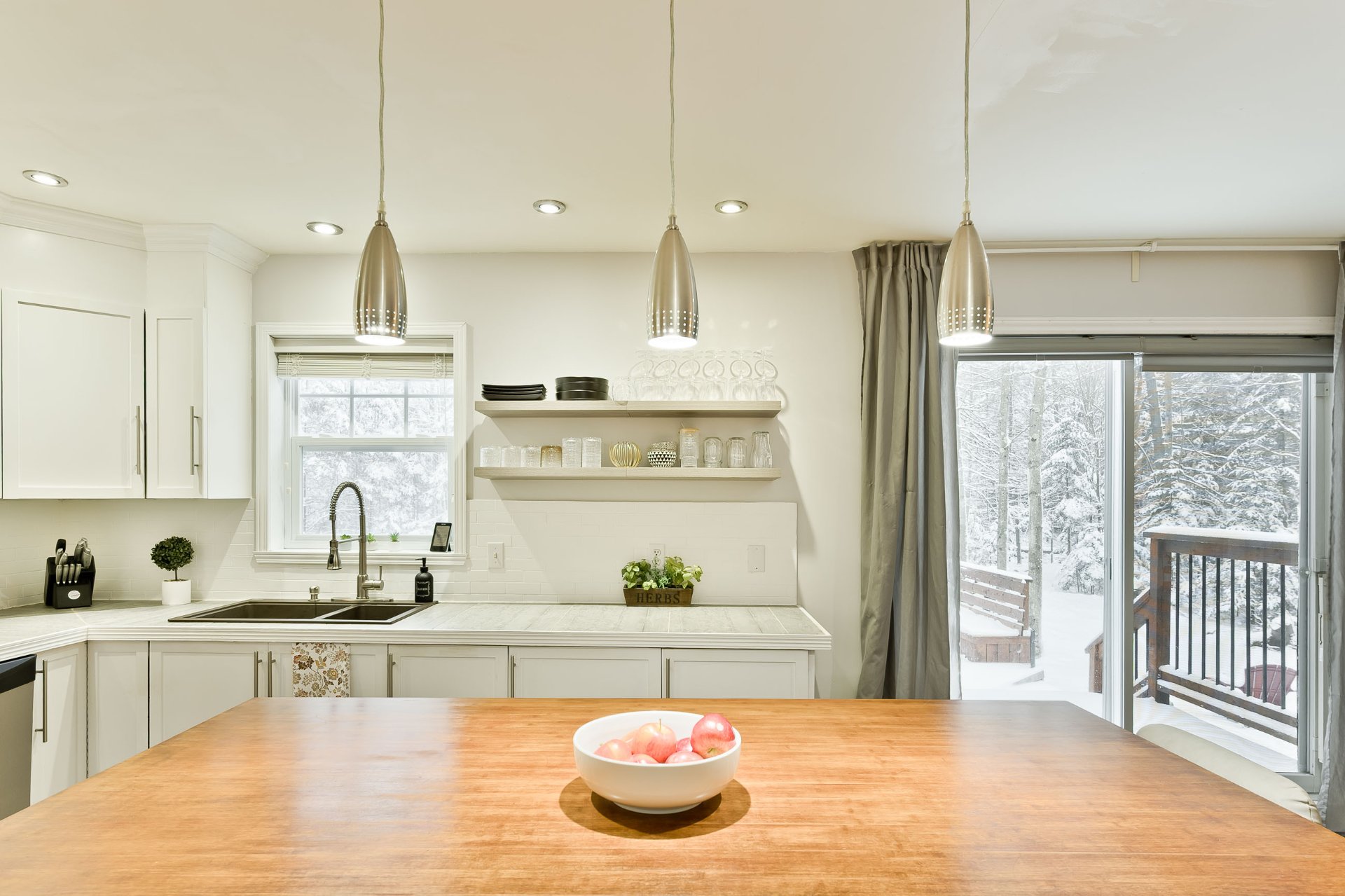 | Inclus | Pôles, rideaux et stores, luminaires, aspirateur central et ses accessoires, micro-ondes intégré, cellier, lave-vaisselle, support à télévision, foyer électrique et meuble du foyer, bancs de l'ilot. |