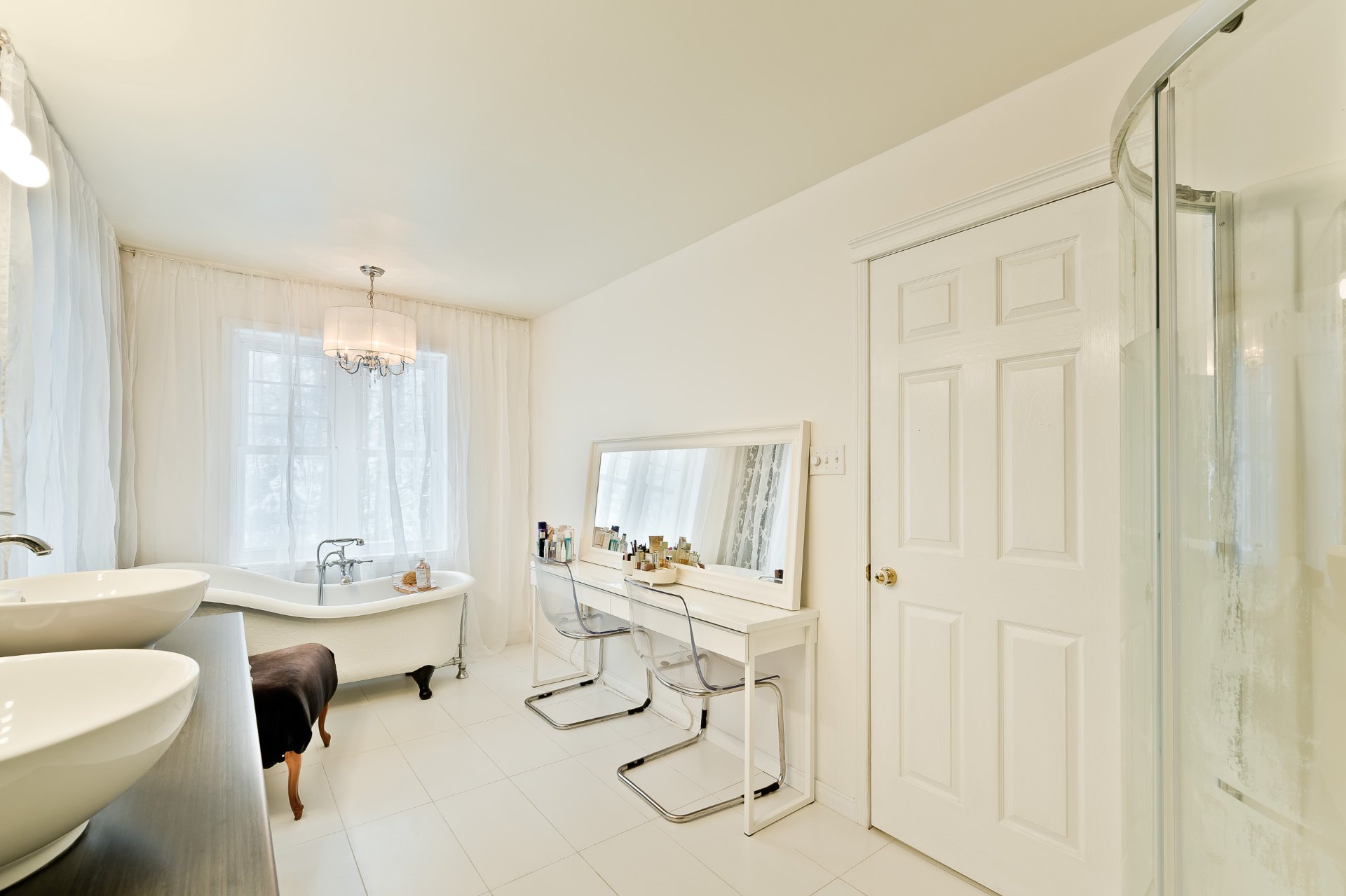 double vanité et un bain sur pattes sous la fenêtre. Ce